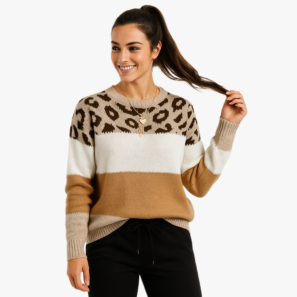 Stylowy pulower z modnym leopardzim wzorem to doskonały wybór na chłodne dni. Wykonany z wysokiej jakości materiałów, zapewnia komfort i ciepło. Idealnie komponuje się z różnymi stylizacjami, dodając charakteru każdemu outfitowi w sezonie jesienno-zimowym.